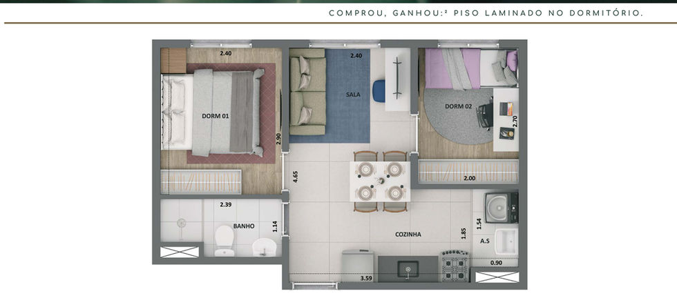 Escolha a planta ideal para você, com opções que variam de 34 a 60 metros quadrados, todas com possibilidade de varanda e acabamentos de alta qualidade, incluindo piso laminado nos dormitórios.